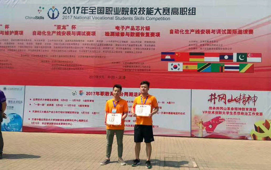 近日2017年全国职业院校技能大赛总决赛在天津主赛区落下帷幕,我院13机电高职2班胡雪龙、简盼龙两位同学在机电工程系李国强、高白川、刘小宁三位老师的精心指导下,首次代表陕西省参加自动化生产线安装与调试(高职组)项目,以出色的表现和精湛的技艺,荣获团体二等奖,充分展示了我院学生良好的动手实践及团队协作能力。