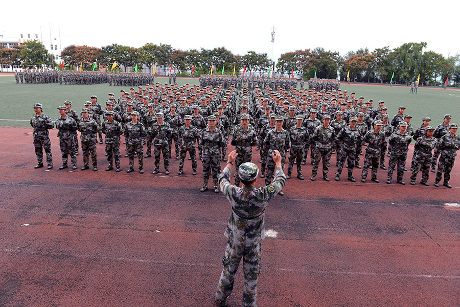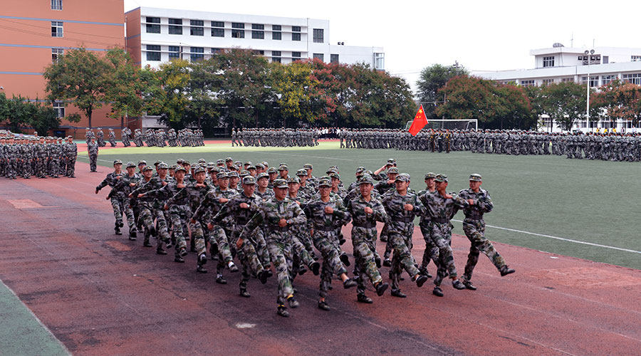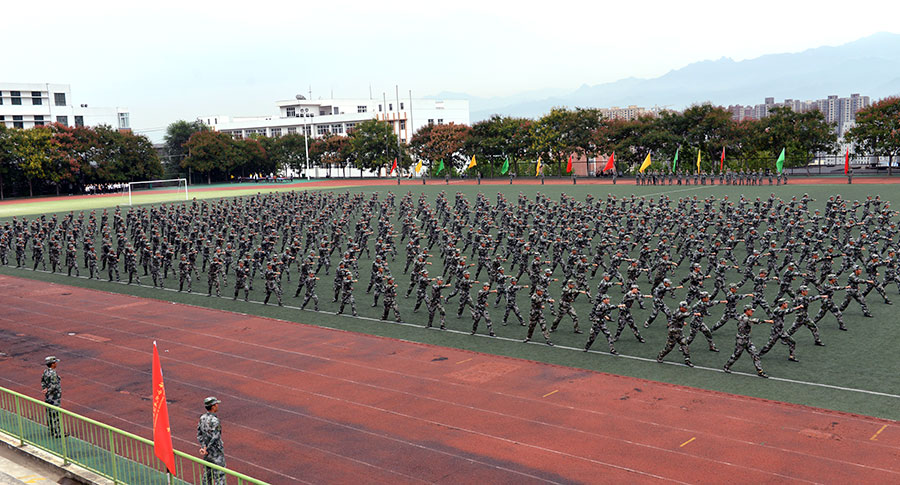 在接下来的军事汇报表演中,同学们以表演内容为单位重组方队,分别表演了队列动作、军体拳、擒敌拳、军歌表演、行进间的方向变换、停止间方向变换、经典诵读等,表演队列整齐划一,刚健有力,展示了我校新生良好的形象和精神风貌。
