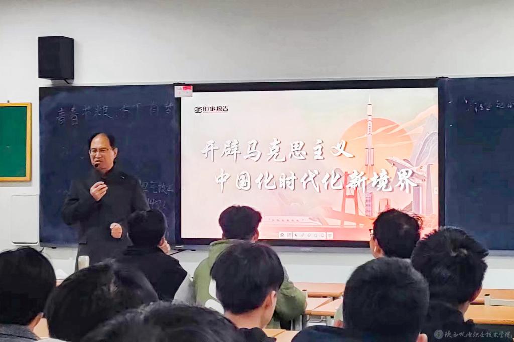 11月7日上午,学校党委书记伊逊智在博学楼315教室为23机电技术9、23机电技术10合班学生上形势与政策课,讲授《开辟马克思主义中国化时代化新境界》《中国经济“形”稳“势”升》两个专题内容。