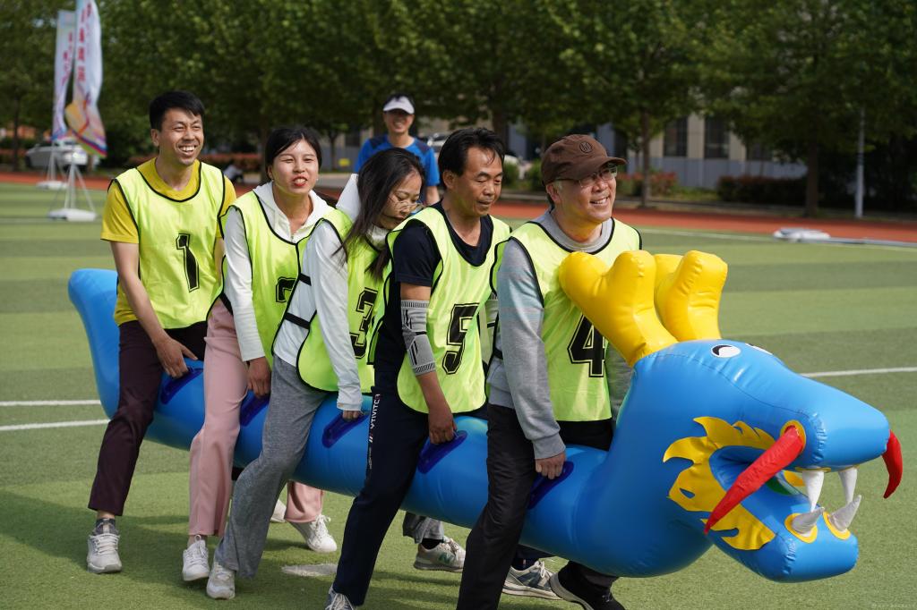 本次趣味运动会在校工会的精心策划和体育部、各分工会的密切配合下,共组成七支教工队参与比赛。设有“飞盘九宫格”“1分钟原地跳绳”“袋鼠跳”“4*100米混合接力”“30米篮球运球绕杆接力”“旱地龙舟”六个项目,集趣味性、娱乐性、协作性和竞争性为一体,既是力量的角逐,又是智慧的较量;既考验个人体育竞技水平,又考验队员之间的默契与配合。