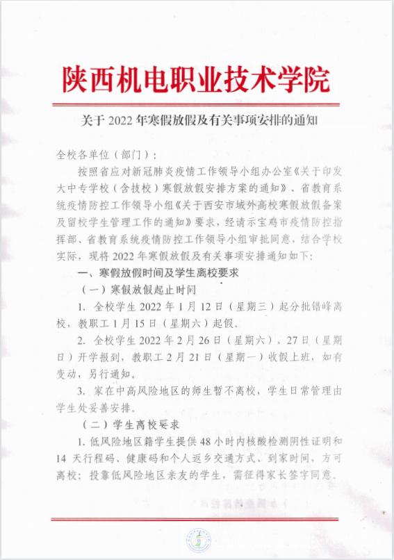 关于2022年寒假放假及有关事项安排的通知